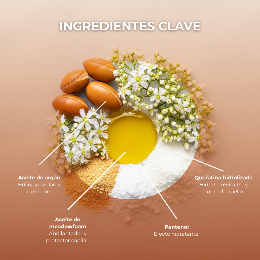 Aceite de Argán Rico en ácidos grasos, vitamina E, escualeno y fitoesteroles, proporciona brillo, nutrición inigualable y un tacto sedoso al cabello.