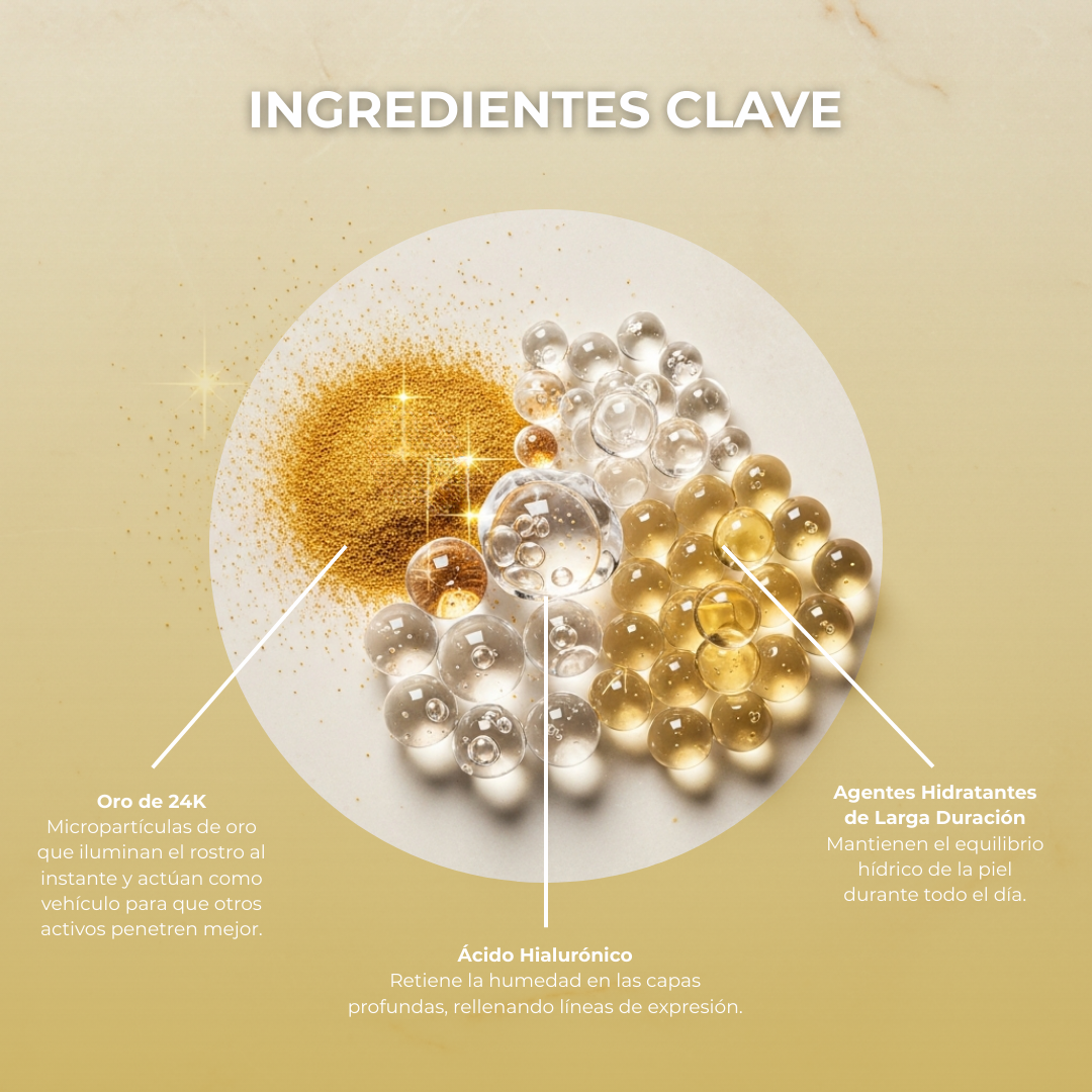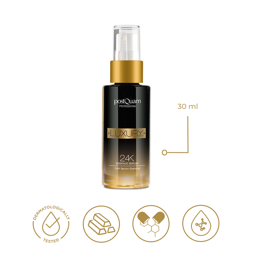 El Luxury 24K Essence Serum de Postquam es un tratamiento facial avanzado que proporciona firmeza, luminosidad y efecto tensor. Su fórmula con Oro Coloidal y Ácido Hialurónico restaura la estructura de la piel, corrige arrugas e imperfecciones, y mejora el tono y la elasticidad, devolviendo un aspecto joven y saludable.