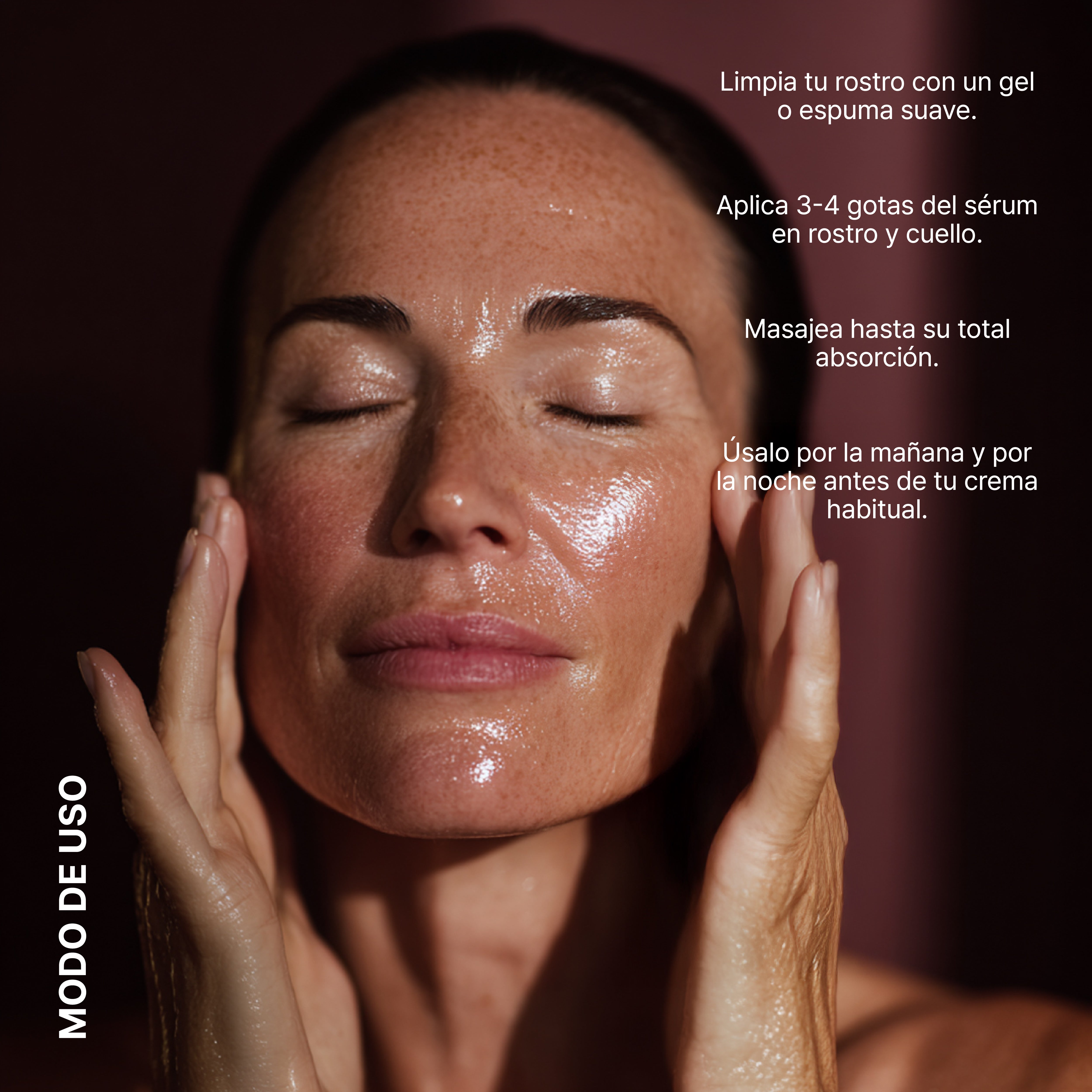 Para lograr mejores resultados aplica el sérum dos veces al día, por la mañana y la noche. Su uso constante garantiza una piel más firme, hidratada y rejuvenecida.