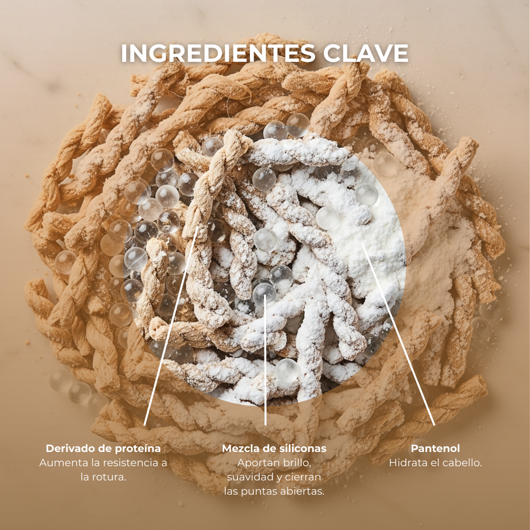 Derivado de Proteína: Fortalece el cabello, incrementando su resistencia a la rotura y mejorando su elasticidad.