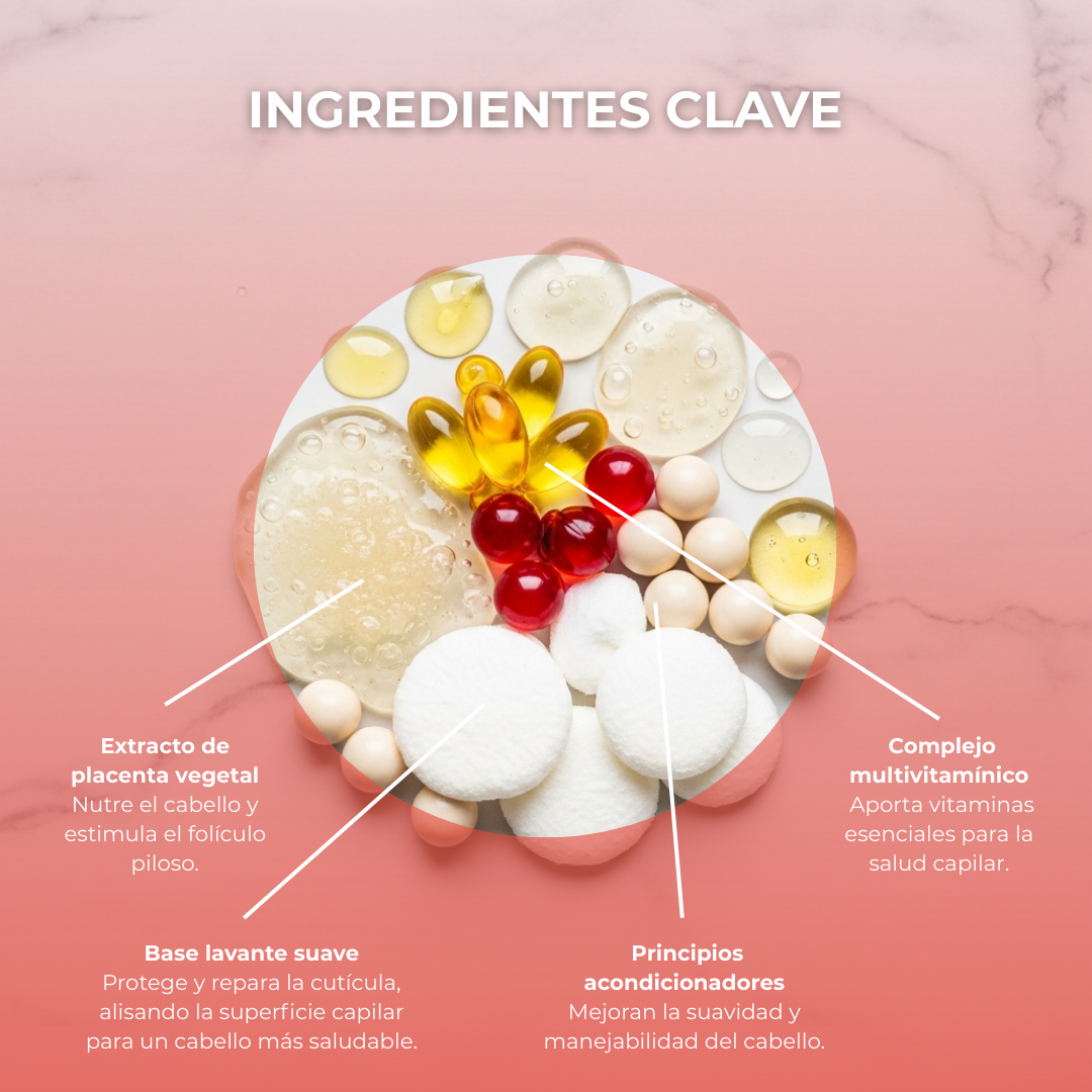 Extracto de Placenta: Nutre intensamente el cabello gracias a su poder hidratante, protege contra el encrespamiento y reduce significativamente la caída del cabello.