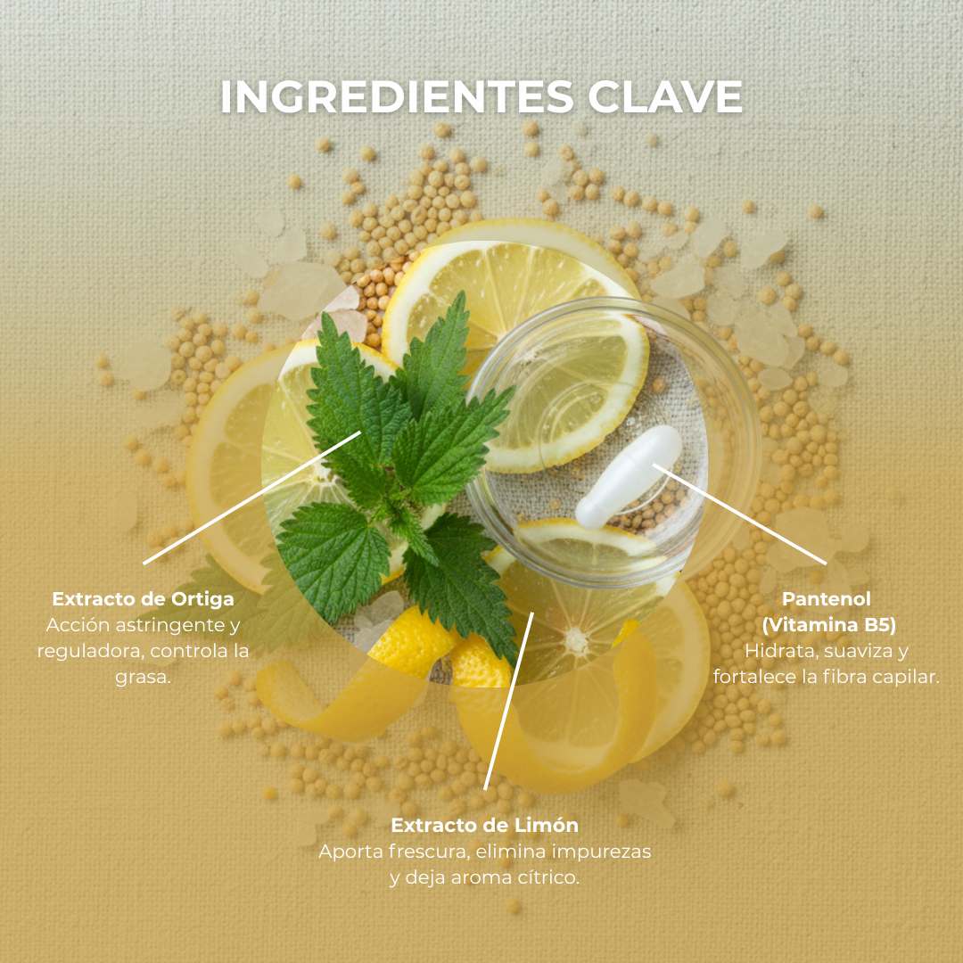 Con ingredientes naturales como el Extracto de Ortiga, el Extracto de Limón y el Pantenol, este champú proporciona una limpieza profunda sin resecar ni dañar la fibra capilar. Al usarlo regularmente, notarás un cabello más fresco, manejable y con un aspecto saludable, sin sensación de pesadez ni residuos grasos.
