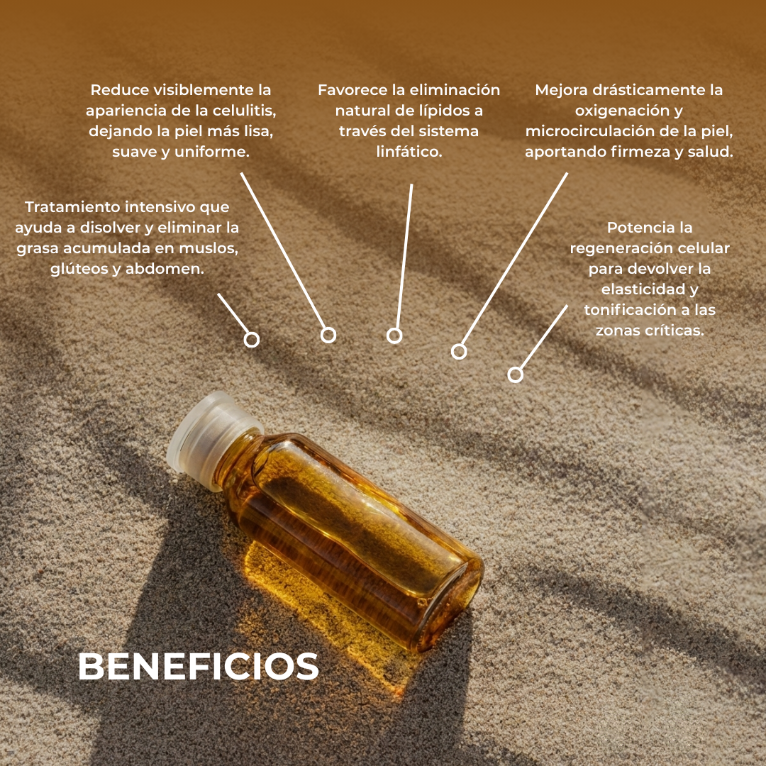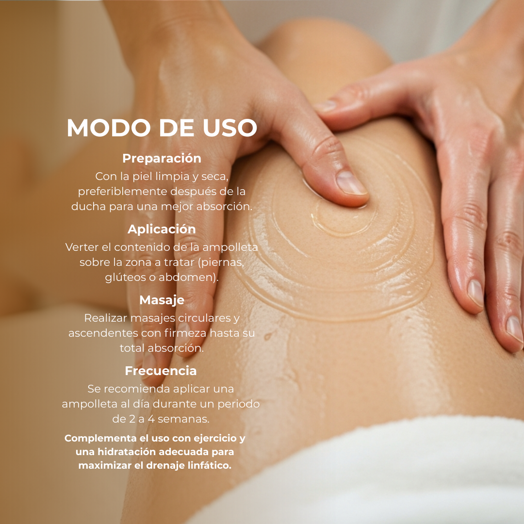 Las Ampolletas Anticelulíticas son un tratamiento intensivo diseñado para reducir la apariencia de la celulitis en zonas clave como muslos, glúteos y abdomen. Gracias a su fórmula líquida concentrada, estas ampolletas penetran rápidamente en la piel, ayudando a disolver la grasa acumulada y favoreciendo su eliminación natural. Su acción mejora la oxigenación de la piel, lo que contribuye a una piel más firme, suave y tonificada.